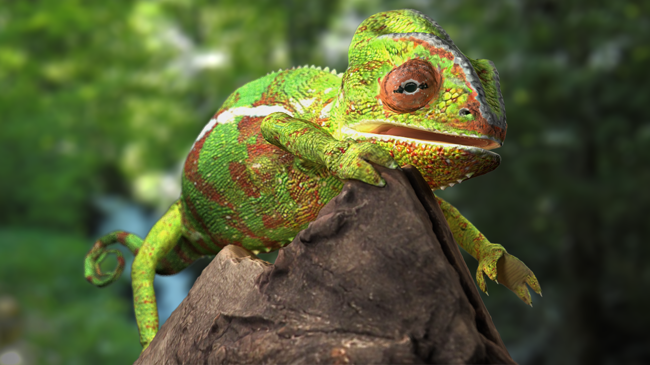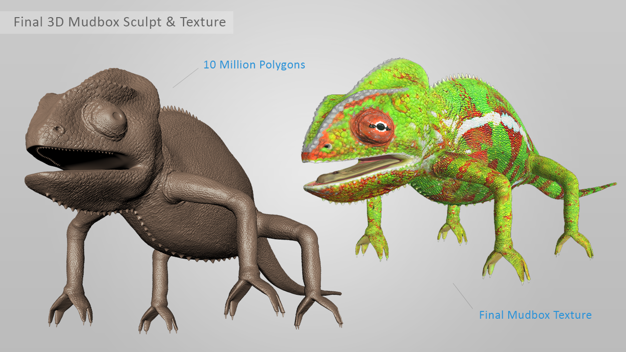The next step was to re-topoligize the low polygon model to properly fit the new high detailed mesh. Once completed I used xNormal to bake out my texture maps and Photoshop to finalize the details in the textures and fix any baking errors. Finally I set up a skeletal rig and bound the chameleon mesh to the rig to allow for full animation or posture changes. For rendering I used Maya with the help of a proper material setup with some lights and HDR global illumination I achieved very pleasing results as seen above.